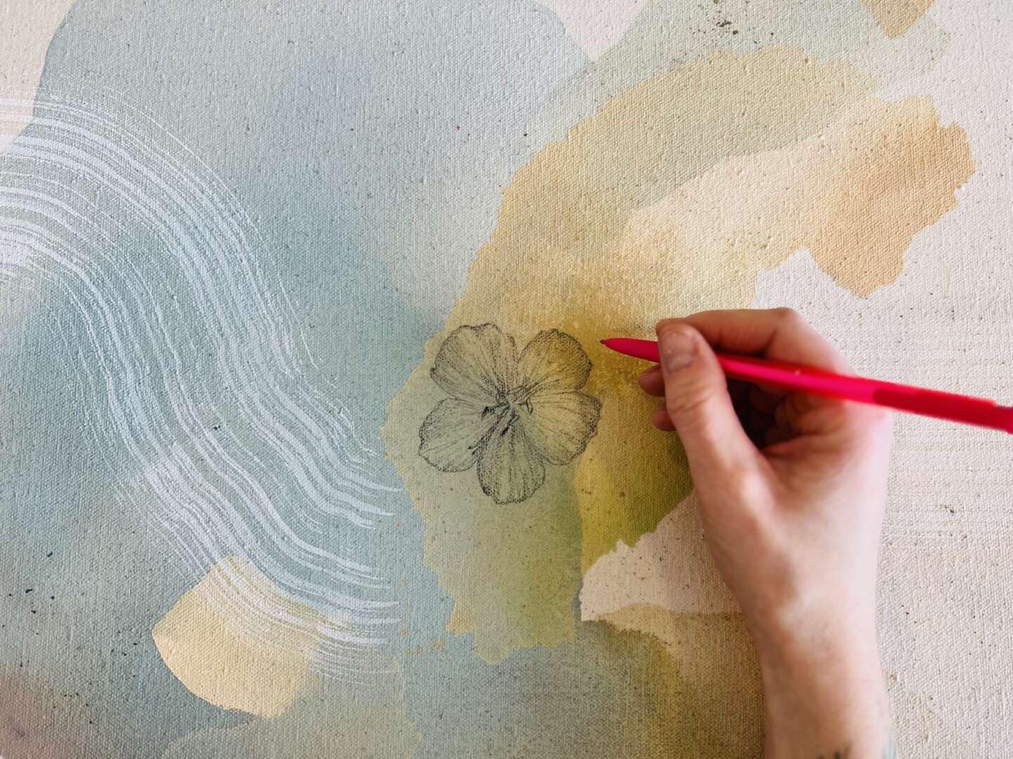 I had been wanting to bring some realism into my work and decided to draw them in illustrative form with a common color palette. This is also the first series I tried raw stretched canvas on frames Matthew made. Other materials used include fluid acrylic paint, raw earth pigment powders, ink pencil, pastel, and graphite for the botanical drawings.